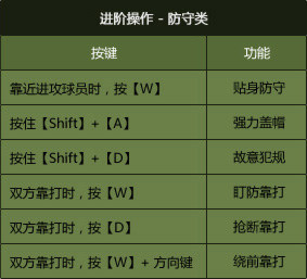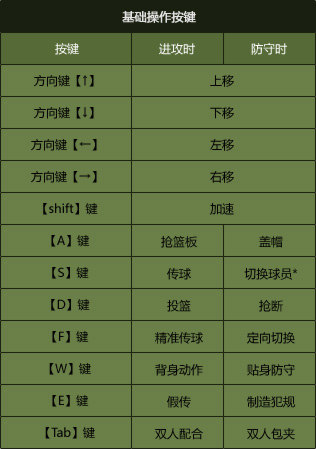 基于篮球比赛攻防转换特别快速,《NBA2K Online》的功能按键在“进攻”和“防守”两个状态下有不同的功能。比如进攻时是投篮的键,在防守状态下就是抢断。除了方向键之外,游戏共提供投篮、传球等8个功能按键。